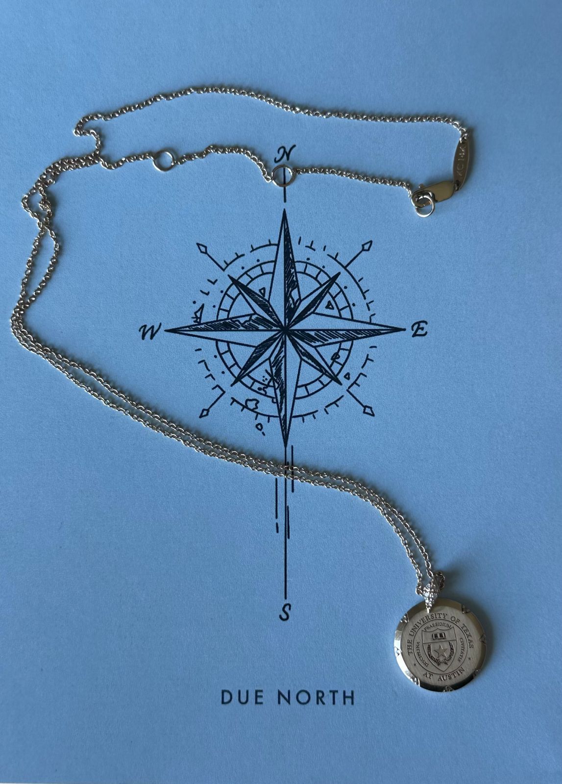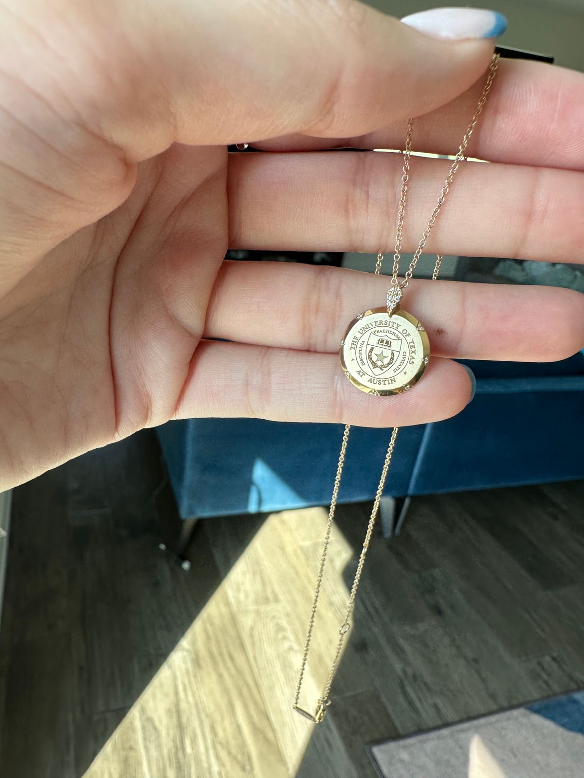 Inspired by a compass, the Mississippi State 7-Point Diamond Necklace features 7 diamonds circling the Florentine design & a diamond encrusted bail always pointing north. Both classic and bold, this necklace is an heirloom-worthy piece perfect for celebrating big accomplishments!